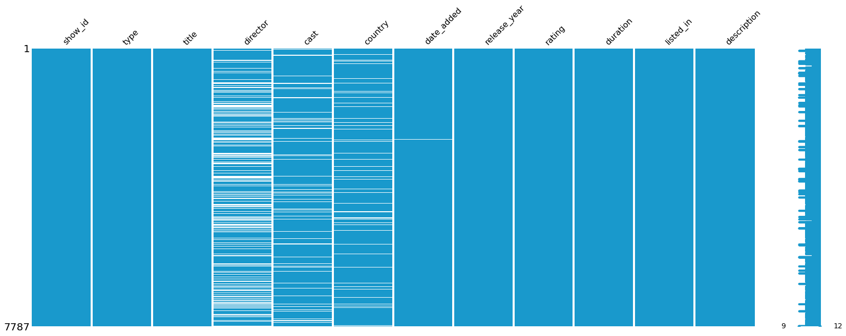 import missingno as msno msno.matrix(df=data.iloc[:, :], color=(0.1, 0.6, 0.8))