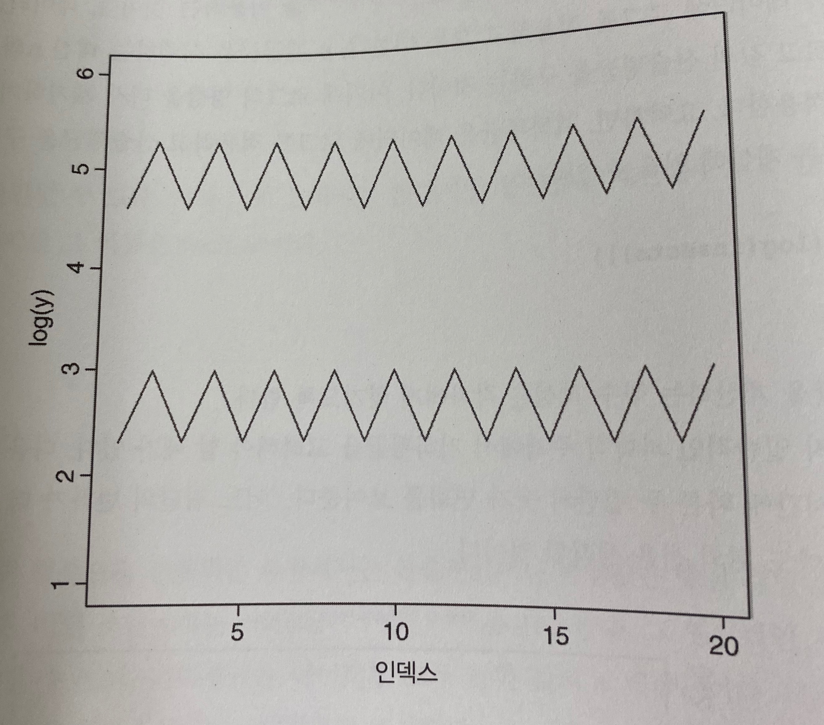 정리하자면 두 집단의 변화는 동일하다. 이렇게 곱의 형식으로 변화하는 데이터를 다룰 때는 원래의 데이터에 로그를 취하여 그래프를 그려봐야 한다.