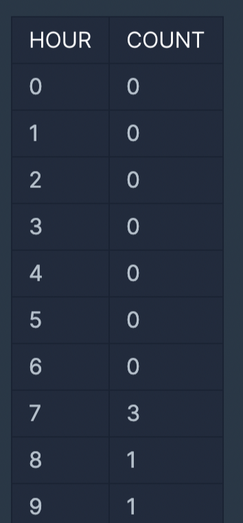 문제를 잘 읽지 않았다. 문제를 다시 읽어보니 0시부터 23시까지 출력을 하라고 했는데 해당 데이터에서는 7시부터 데이터가 존재한다. 그래서 0~6시까지의 결과가 출력되지 않았다.