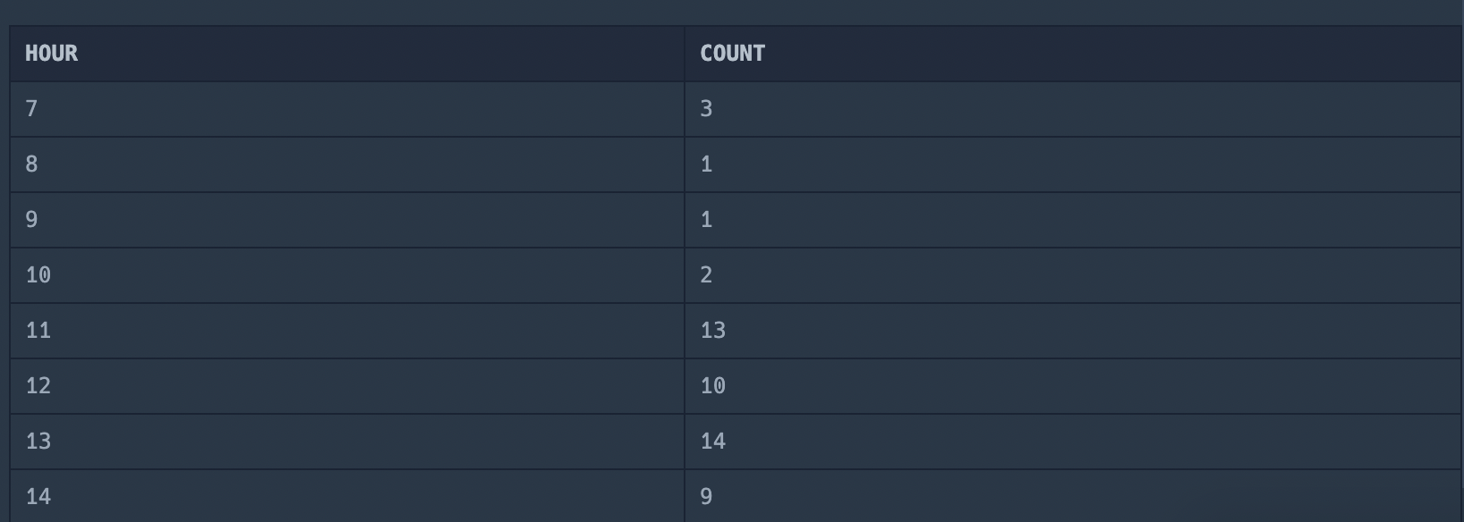 문제를 딱 보고 되게 쉽다고 생각했다. HOUR함수로 시간을 추출하고, GROUP BY 해서 COUNT하면 되겠다고 생각했다. 근데 틀렸다고 한다.ㅜㅜㅜ 우선 내가 생각한 방식대로 출력을 하면 다음과 같이 나온다.
