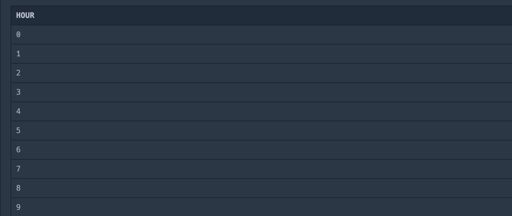 - HOUR 변수를 -1로 선언하여서 22까지 +1씩 더해주었다. -1부터 더했기 때문에 0부터 23까지 생성이 된다.