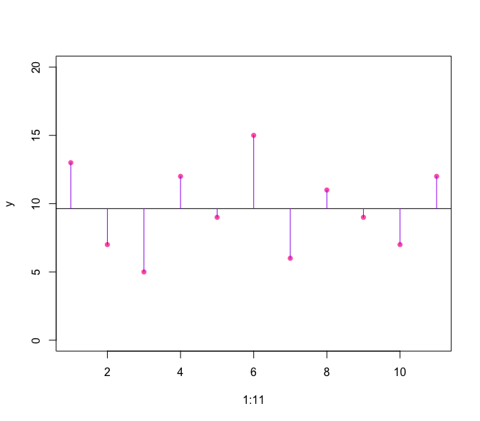 for(i in 1:11) lines(c(i,i), c(mean(y), y[i]), col="purple")