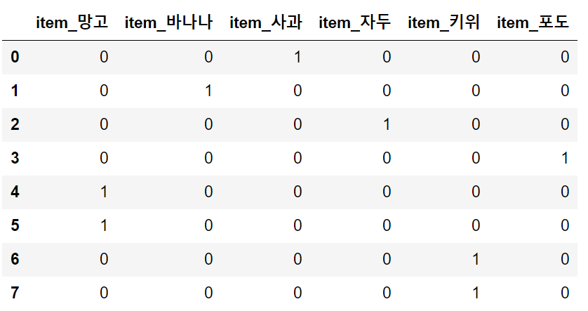 df=pd.DataFrame({'item':['사과', '바나나', '자두', '포도', '망고', '망고' ,'키위','키위']})
