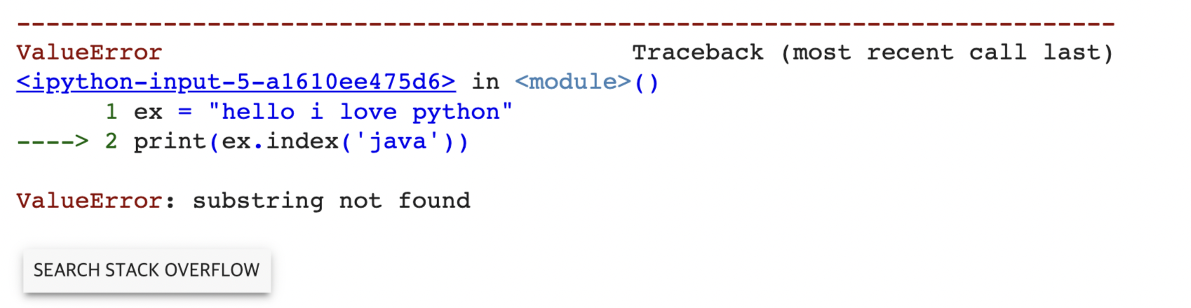 다음은 index이다. index의 경우 똑같이 원하는 문자열이 존재하지 않는 상황에서 다르게 반환을 해준다. indexa 에서는 다음과 같이 에러 메세지(ValueError)를 출력을 한다. 상황에 따라 원하는 함수를 적절하게 써야 할 듯!!