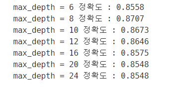 결과를 보면 max_depth가 8일때 약 87.07으로 가장 높은 정확도를 나타내고 있습니다. 그리고 max_depth가 8을 넘어가는 순간 정확도가 계속 감소하는 것을 알 수 있습니다.