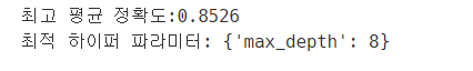 max_depth가 8일 때 5개의 폴드 세트의 최고 평균 정확도가 약 85.26%로 나왔습니다.