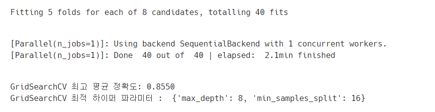 max_depth가 8, min_samples_split이 16일때 가장 최고의 정확도로 약 85.5%를 나타냅니다.