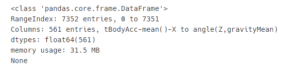 학습 데이터 세트는 7352개의 레코드로 561개의 피처를 가지고 있습니다.