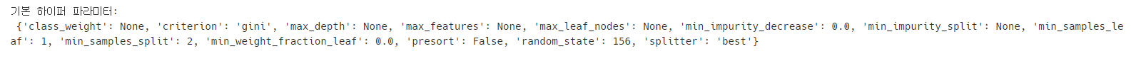 print('기본 하이퍼 파라미터:\n', dt_clf.get_params())