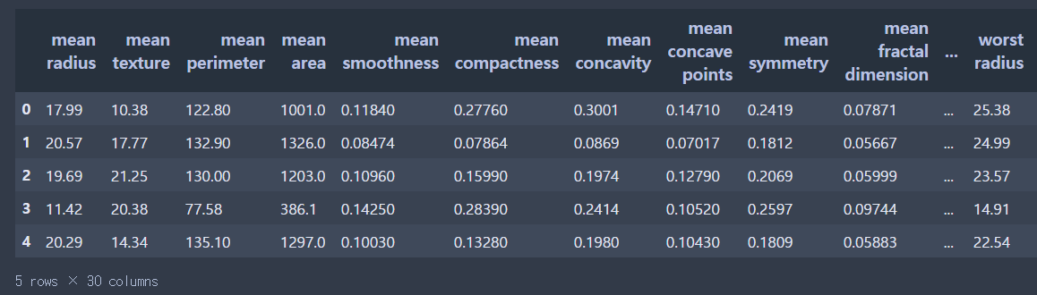 data_df = pd.DataFrame(cancer.data, columns = cancer.feature_names)