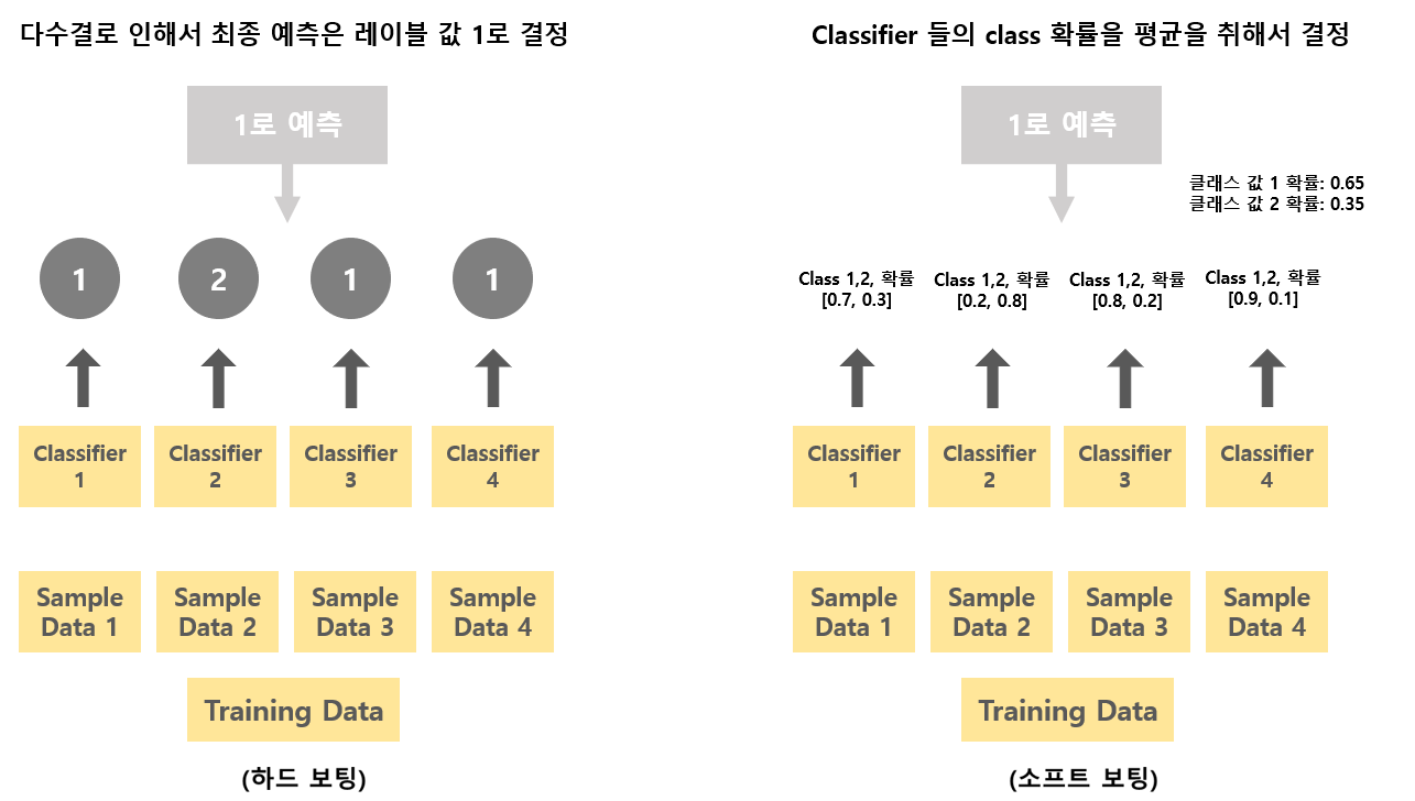 왼쪽 그림 하드 보팅은 분류기 1번, 3번, 4번이 1로 레이블 값을 예측하고 분류기 2번이 2로 레이블 값을 예측했기 때문에 다수결 원칙에 의해서 최종 예측은 레이블 값 1로 결정이 됩니다.