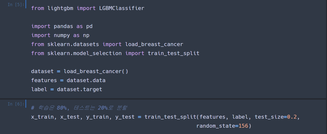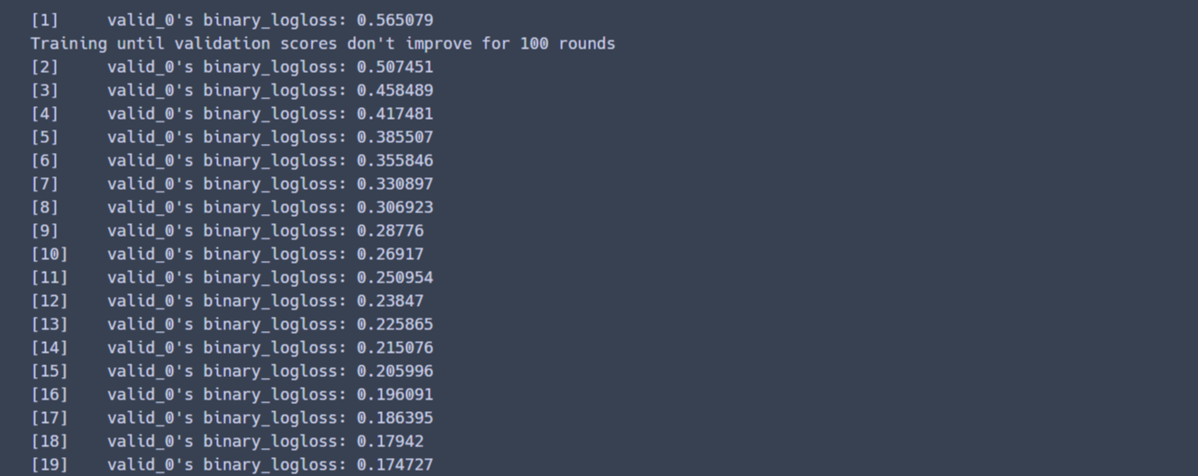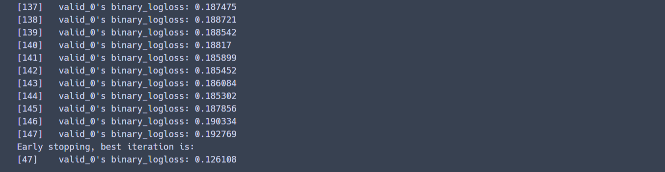 LightBGM도 조기 중단을 할 수 있습니다. XGBClassifier와 동일하게 fit()에 파라미터를 설정해주면 됩니다.