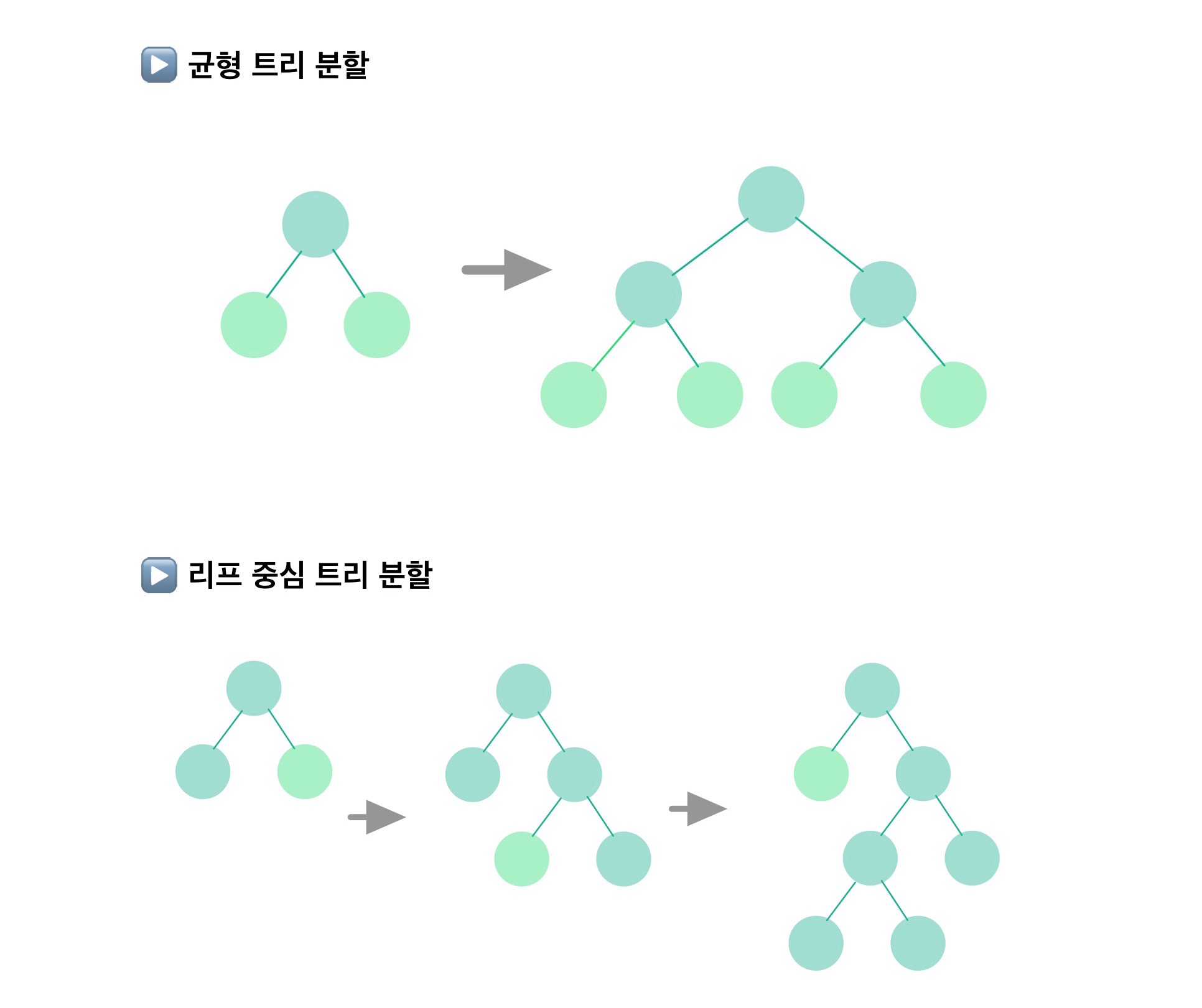 LightGBM은 리프 중심 트리 분할(Leaf Wise) 방식을 사용합니다. 기존의 트리 기반 알고리즘은 균형 트리 분할(Level Wise) 방식을 사용합니다. 풀어서 설명하자면 최대한 균형이 잡힌 트리를 유지하면서 분할하기 때문에 트리의 깊이가 최소화가 될 수 있습니다. 반대로 균형을 맞추기 위한 시간이 필요하다는 단점이 존재합니다.