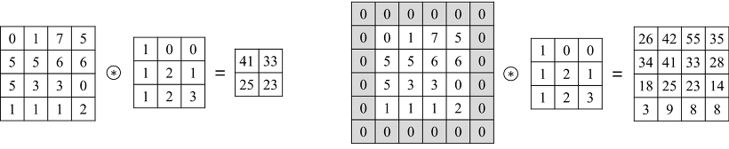 위 그림에서 오른쪽이 패딩을 적용한 그림입니다. CNN에서는 이 처럼 가장자리에 0의 값을 가지는 픽셀을 추가하는 zero-padding을 많이 사용합니다. 왼쪽과 오른쪽을 비교해보면 오른쪽 그림은 원본데이터의 크기가 그대로 유지되는 것을 알 수 있습니다.