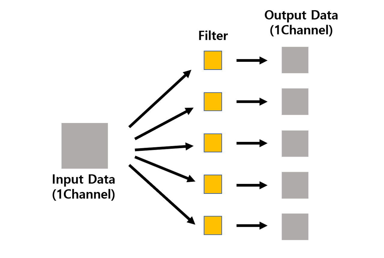 위 예제는 크기가 5x5인 데이터를 1개의 필터(커널)로 합성곱 연산을 수행하는 과정입니다.