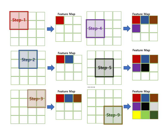 필터를 적용하는 간격을 Stride라고 하며 필터를 적용하여서 얻은 결과를 Feature map 또는 activation map이라고 합니다.