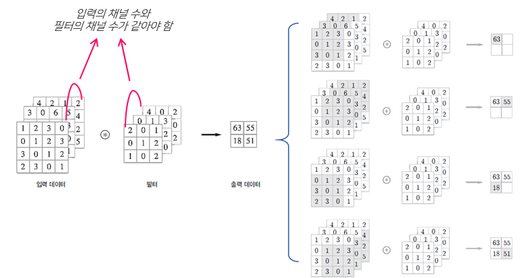 3차원 합성곱에서 주의할 점은 입력 데이터의 채널 수와 필터의 채널수가 같아야 한다는 점입니다!!