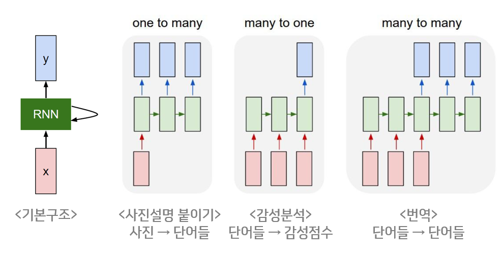 RNN은 시퀀스 길이에 상관없이 인풋, 아웃풋을 받을 수 있는 구조이기 때문에 원하는 모델에 따라서 다양하게 구조를 만들 수 있습니다. 이것이 RNN의 장점 중 하나입니다.