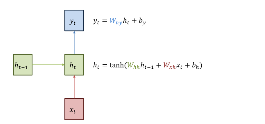 RNN의 기본 구조는 다음 그림과 같습니다. 빨간색 박스는 인풋, 파란색 박스는 아웃풋, 그리고 녹색 박스는 현재 히든 state를 의미합니다. 현재 상태의 히든 state는 직전 시점의 ht-1을 갱신 받는 구조 입니다.